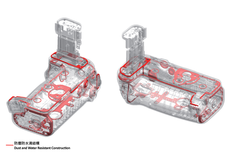 電池手柄 BG-R20EP 亦具備與 EOS R5 Mark II 同級的防塵防水滴設計3,在需要防塵和防水滴的地方 (如:按鈕、電池匣、乙太網絡端子) 都使用了密封材料,轉盤中亦採用防塵防水滴部件。
