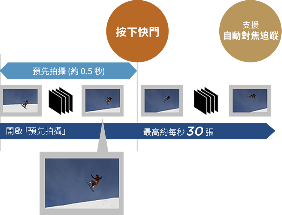 EOS R10 亦加入「RAW連拍模式」6,能以每秒約 30 張速度拍攝約 1.33x 裁切的影像;更支援「預先拍攝」功能,可記錄按下快門前0.5秒的畫面,確保記錄到最精彩時刻。