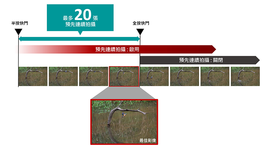 EOS R6 Mark III 新增「預先連續拍攝」功能3,讓用家可以記錄在完全按下快門按鈕之前的 20 張連續拍攝相片,對於拍攝以往攝影師必須利用直覺及經驗捕捉的困難主體時,能降低拍攝失敗的風險,讓用家更安心。