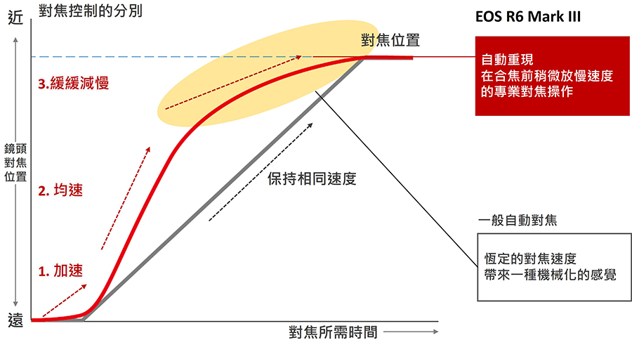 EOS R6 Mark III 的短片伺服自動對焦採用了與 Cinema EOS C400 / C80 / C50 相同的對焦加速 / 減速演算法,重現專業攝影師精準且細膩的對焦操作。用家透過短片伺服自動對焦,即可模擬專業跟焦員的流暢對焦表現,滿足創作者對視覺表現的需求。