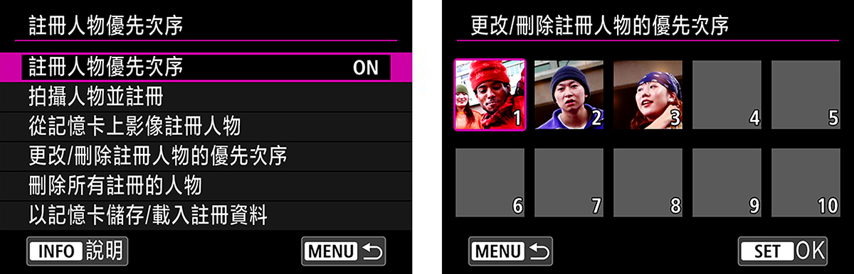 EOS R6 Mark III 新增了與 EOS R3 相同效能的註冊人物優先功能,攝影師可以預先在相機中註冊最多 10 個人物,拍攝時即使自動對焦區域/對焦點範圍內出現多個人物,仍能優先偵測已註冊的特定人物4。適用於拍攝短片及靜態相片,特別用於多人場景、記者會等拍攝環境。