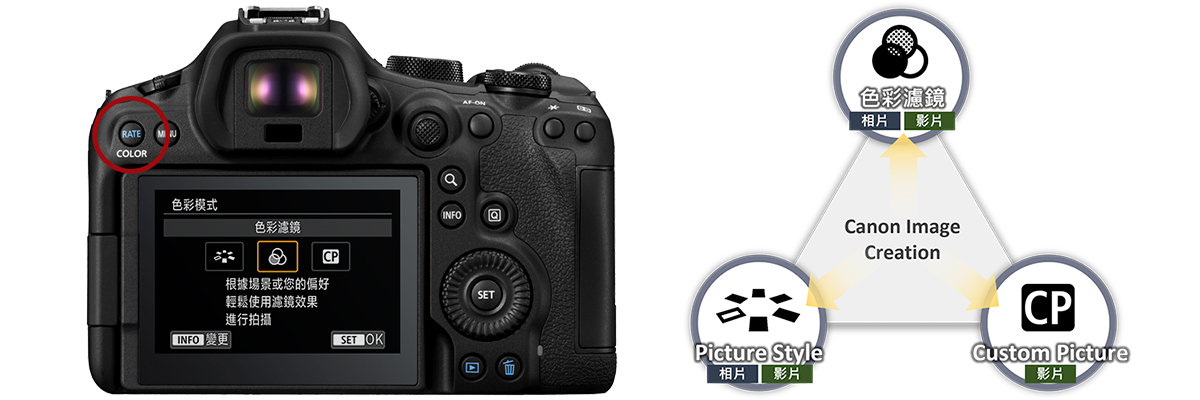 EOS R6 Mark III 新增色彩模式按鈕 (COLOR) ,讓用家快速從相片風格、色彩濾鏡及 Custom Picture16 三種色彩模式中選擇。