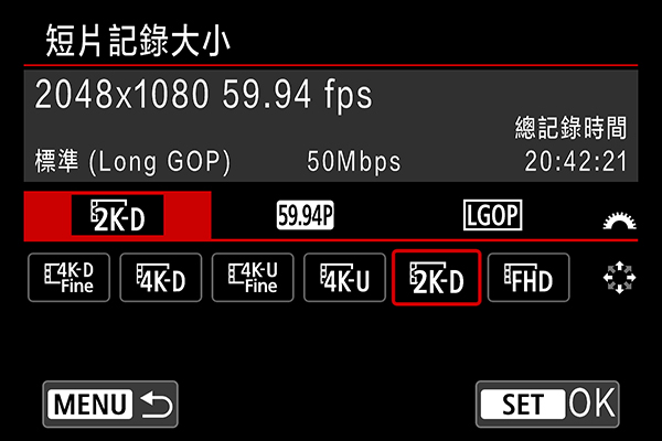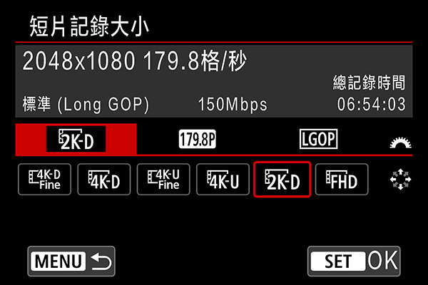 | 短片記錄格式 | RAW (Open Gate):6960×4640 7K Open Gate MP4: 6912x4608 4K DCI MP4:4096x2160 2K DCI MP4:2048x1080