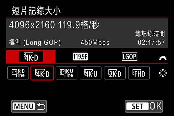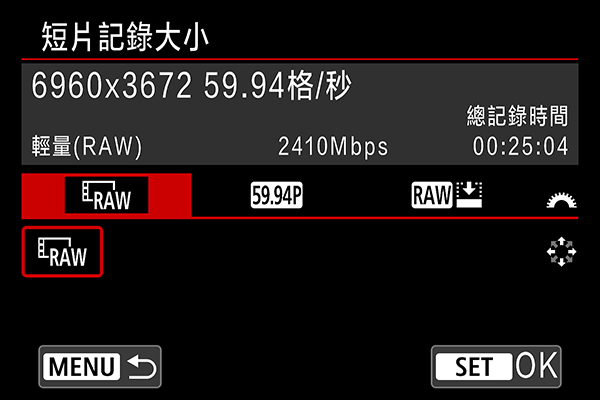 | 記錄大小及影片幀數 | RAW: 59.94*1 / 50.00*1 / 29.97 / 25.00 / 24.00 / 23.98fps |