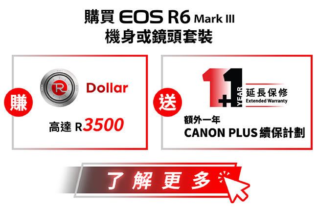EOS R6 Mark III 是首次配備 7K Open Gate 片門全開 (3:2) 影片記錄的 EOS R 系列可換鏡相機,為進階攝影愛好者帶來全新的混合拍攝體驗。EOS R6 Mark III 的 3,250 萬像素全片幅 CMOS 影像感應器,支援電子快門1每秒 40 張2 連續拍攝及預先連續拍攝功能3 。EOS R6 Mark III 配備雙像素 CMOS 自動對焦 II ,加入註冊人物優先功能4,為影片及相片帶來高速、準確的自動對焦。