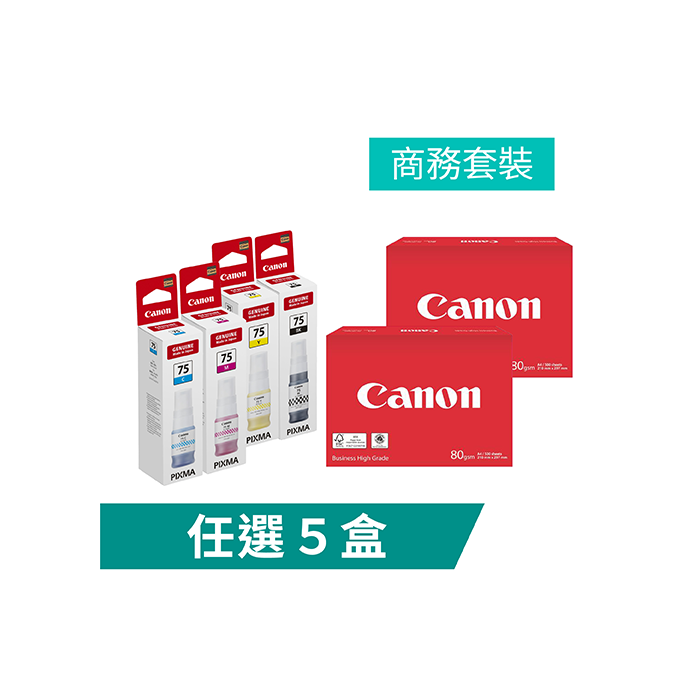 購買任何 5 盒 GI-75 墨水及兩疊影印機 A4 專用紙即享 9 折優惠。*優惠受條款及細則約束,每張訂單只限使用優惠一次,折扣將於購物車內顯示。