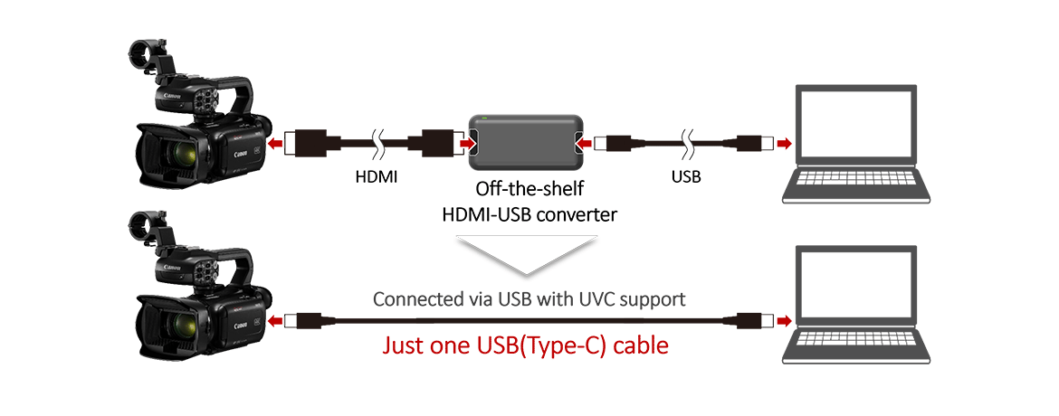 支援USB Video Class (UVC*) 標準,只需透過USB連接電腦,即可識別為網路攝像鏡頭,無需額外轉接器,大大簡化串流直播流程