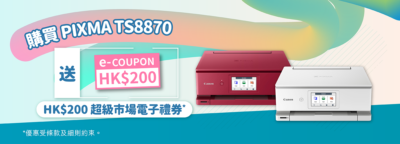【指定打印機禮券換領優惠】由即日起至 2026 年 2 月 28 日購買 PIXMA TS8870,即可免費獲贈 HK$200 超市禮券。