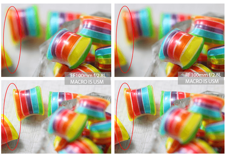 「鏡頭呼吸效應」(Lens Breathing) 是於對焦時因放大率改變而出現的現像,在微距拍攝時會更明顯。RF100mm F2.8 L MACRO IS USM 在1.0x 放大率時,「鏡頭呼吸效應」 比EF版本減少約50%。