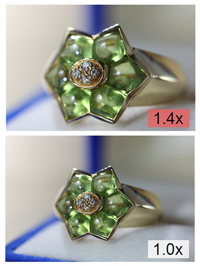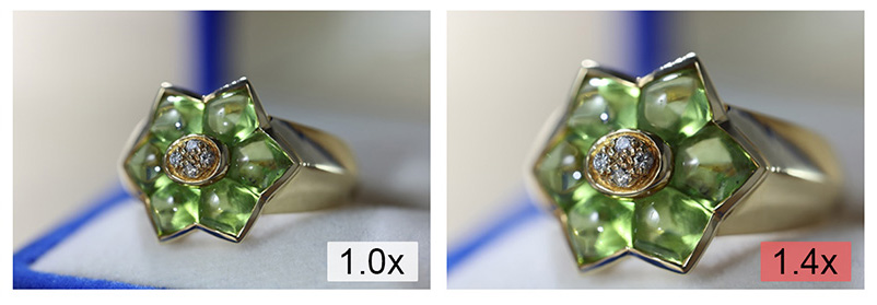 在1.4x放大率時的最近對焦距離約為 0.26米,此時鏡頭最前端到主體的工作距離仍可達約8.6厘米,避免了由於攝影器材過於靠近主體產生陰影,亦可讓用家自靈活地進行燈光佈置