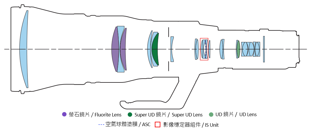 鏡頭後段的放大光學鏡組最前端亦加入1片UD鏡片以修正因放大而引起的色差,提供比現有鏡頭加裝增距鏡更高的影像質素。