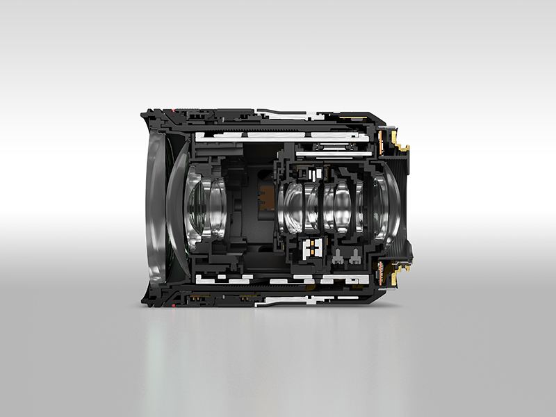採用3片高精度玻璃模鑄 (GMo) 雙面非球面鏡片,有效修正球面像差、變形及像散 (Astigmatism) ,為整個變焦範圍由畫面中心至邊緣提供超卓影像質素。