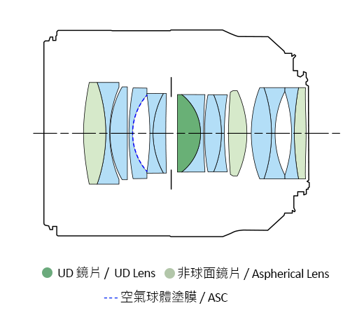 鏡頭亦加入1片UD超低色散鏡片,能有效消除軸向色差及倍率色差,達至高解像度及高反差的影像質素。
