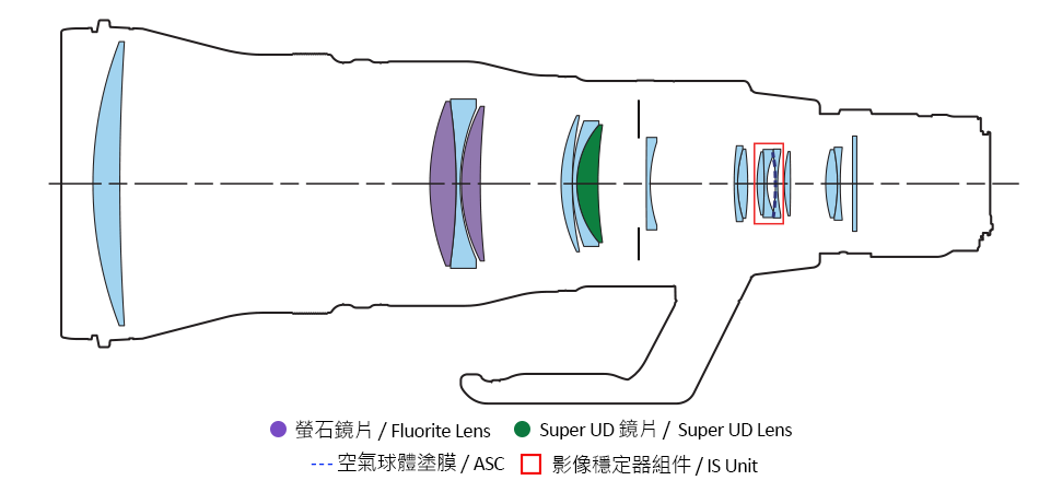 RF600mm F4 L IS USM 加入2片螢石鏡片,有效消除像差。