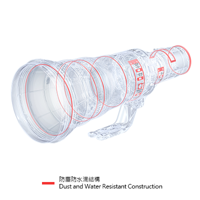 鏡身及鏡頭遮光罩採用白色抗熱塗層,有效減低炎熱天氣時鏡頭的溫度提升幅度以確保穩定的光學性能。