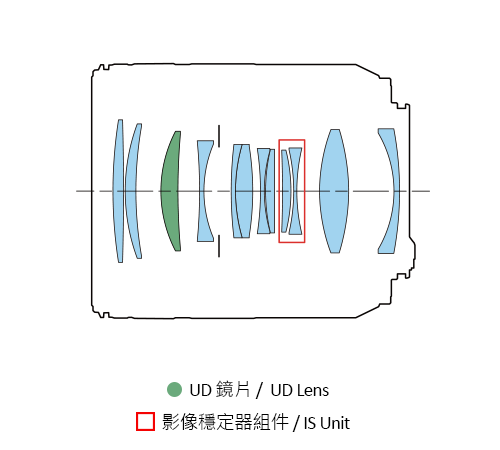 鏡頭加入了1片UD超低色散鏡片,可有修正在對焦點前後出現的軸向色差,從而提升整個對焦範圍的影像質素。
