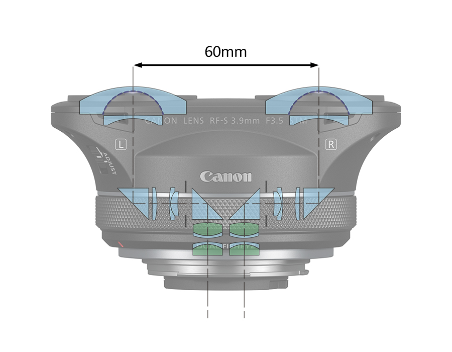 每支鏡頭採用創新的8組11片折疊式光學 (Folded Optics) 設計,加入2個稜鏡以在 APS-C 影像感應器 (約22.3 x 14.8mm ) 上實現基線長度 60mm 的自然視差 (parallax),只需直接將此可換鏡頭安裝至 EOS R7 1 就可以拍攝 3D VR 影像而不需要使用專用的相機,大幅簡化 3D VR 拍攝流程。