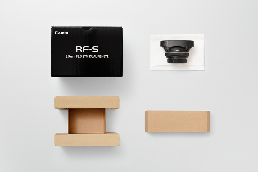 在 RF-S3.9mm F3.5 STM DUAL FISHEYE 中,Canon 透過以紙板及植物基無紡布取代塑膠緩衝托和塑膠氣泡包裝,減少塑膠廢物並有助於減少對環境的影響。