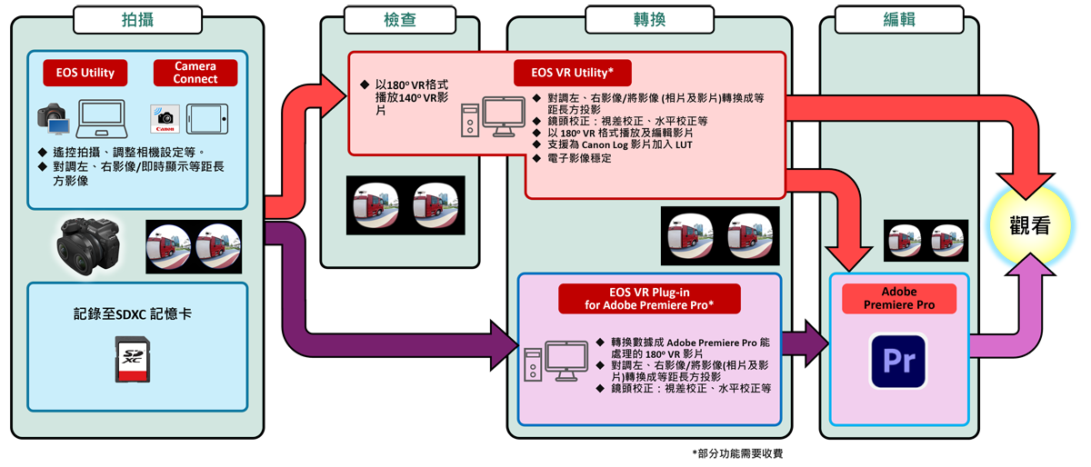 拍攝完成後,用家可使用 EOS VR Utility 電腦軟體 (付費訂閱服務) 或 EOS VR Plugin for Adobe Premiere Pro (付費訂閱服務) 輕鬆將影像轉換成 180 o VR 格式的等距長方投影 (Equirectangular Projection),更可在轉換時自動校正水平及鏡頭視差,進一步改善工作效率。其中,EOS VR Utility 支援影像轉換、電子影像穩定及基本剪輯,亦能根據後期製作及顯示環境需要調整影像質素及檔案格式的彈性。而 EOS VR Plugin for Adobe Premiere Pro 則讓用家可以在 Adobe Premiere Pro 編輯軟體中進行檔案轉換及後期編輯。