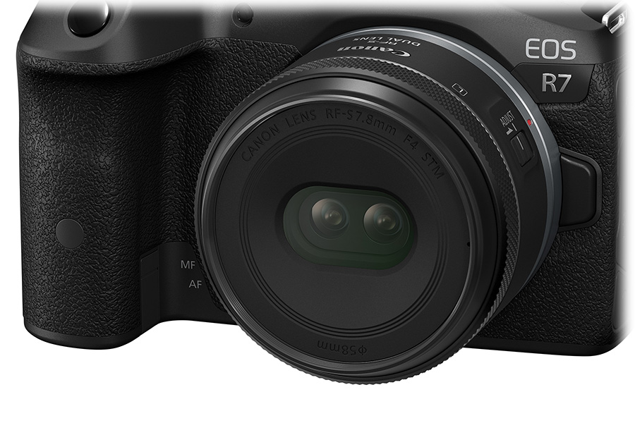 獨特的 RF-S7.8mm F4 STM DUAL 是由左、右兩支鏡頭組成的 APS-C 3D 鏡頭,是 EOS VR 系統的其中一員。鏡頭配合 EOS R7 無反相機1使用時能透過左、右兩支鏡頭影像間的視差 (parallax) 輕鬆拍攝 3D 影像,提供逼真的立體效果,讓影像創作者可以輕鬆地拍攝出感覺主體就在觀眾面前的高質素 3D 影像。