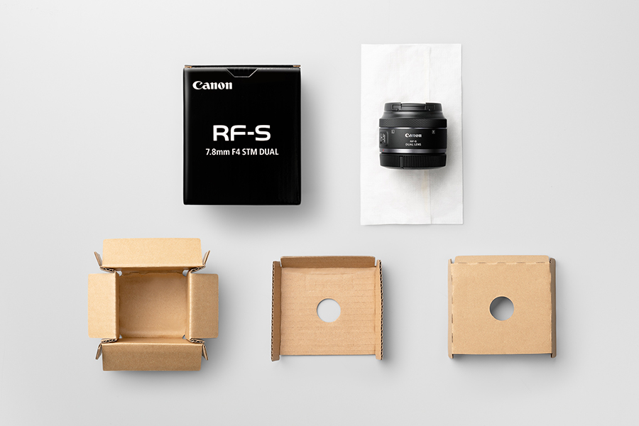 在RF-S7.8mm F4 STM DUAL 中,Canon透過以紙板及植物基無紡布取代塑膠緩衝托和塑膠氣泡包裝,減少塑膠廢物並有助於減少對環境的影響。