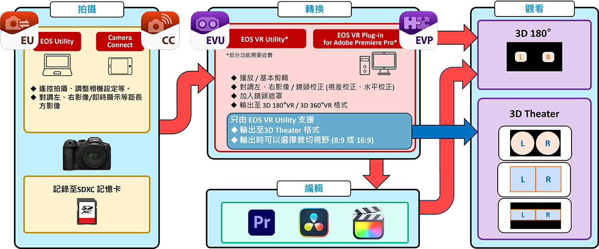 EOS VR 系統除了兼容的相機及 VR 鏡頭外,遙控拍攝與格式轉換應用程式亦是 3D 製作流程中不可或缺的一環。