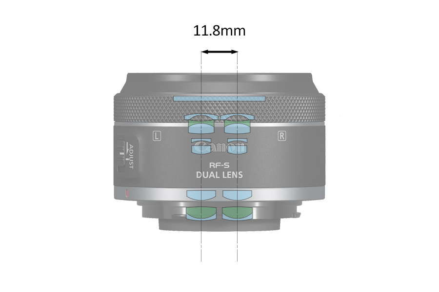 RF-S7.8mm F4 STM DUAL 由左、右兩支鏡頭組成,提供與人類視角相似的63o 視角,讓拍攝 3D 影像更輕鬆。鏡頭使用中央投影設計 (Center projection),每支鏡頭採用無稜鏡的 7 組 9 片直型光學設計,在 APS-C 影像感應器 (約22.3 x 14.8mm ) 上提供基線長度 11.8毫米 的視差 (parallax),在實現 3D 鏡頭性能的同時能控制整體尺寸。