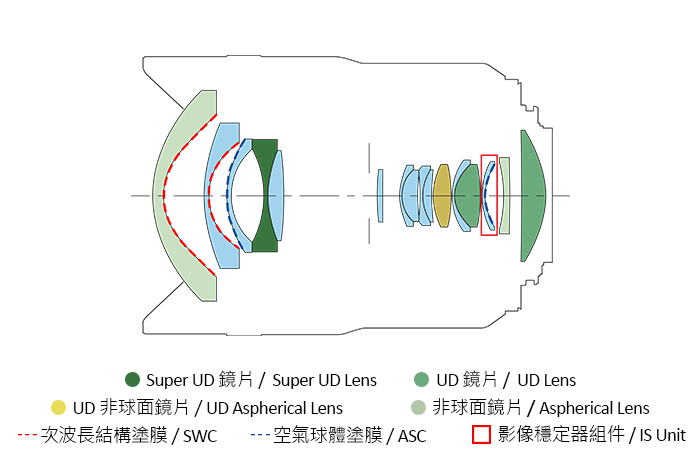 鏡頭亦加入1片媲美螢石的Super UD超級超低色散鏡片及2片UD超低色散鏡片校正在整個變焦範圍內的色差,達至高解像度及高反差的影像質素。