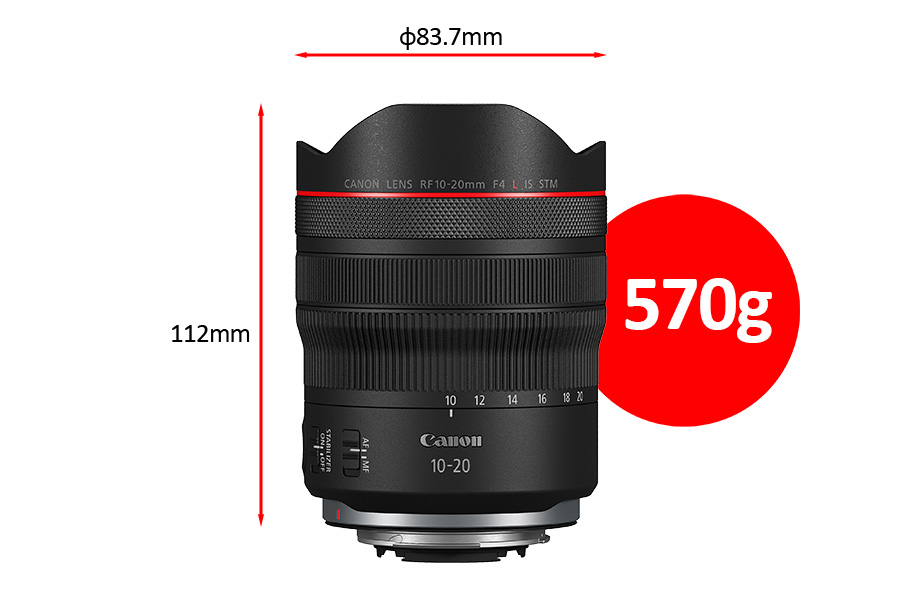 作為RF鏡頭陣容中F4 L 變焦鏡頭的一員,RF10-20mm F4 L IS STM 尺寸與其他F4 L鏡頭接近,重量更比RF24-105mm F4 L IS USM 及RF70-200mm F4 L IS USM輕約100g。