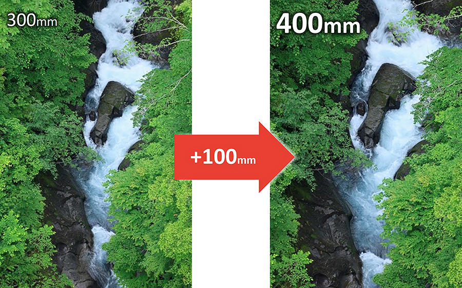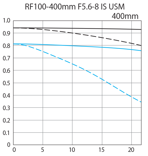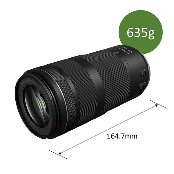 焦距達400mm的輕巧RF變焦超遠攝鏡頭,長度只有約164.7mm而重量只有635克。鏡頭的9組12片光學設計大幅減少鏡片﹐但仍保持出色的影像質素,其中1 片UD低色散鏡片能有效為整個變焦範圍改正色差;而1片PMo非球面鏡片能提升畫面解像度及對比度。鏡頭於400mm時,可於1.05米對焦距離提供高達0.41x的放大率。而鏡頭的光學影像穩定器提供達 5.5 級¹防震效果,當配合配合機身防震進一步提升防震效果至6 級²,讓手持拍攝更輕鬆。