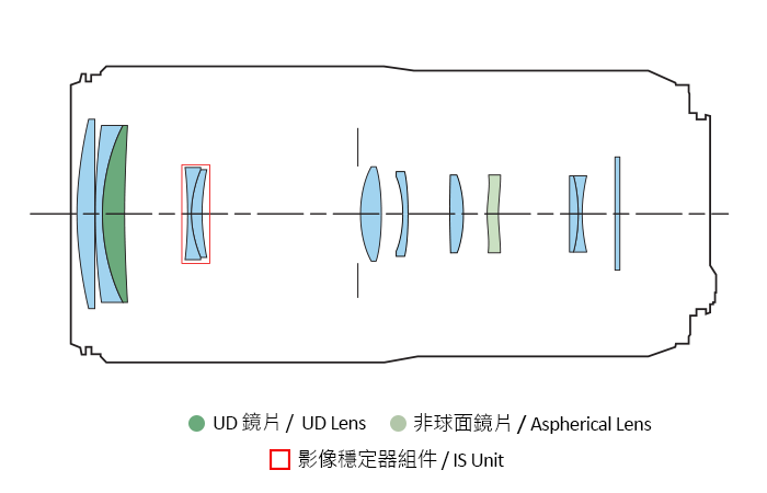 鏡頭加入1片UD超低色散鏡片,有效為整個變焦範圍修正色差及減少色彩模糊,1片PMo非球面鏡片則提升畫面解像度及對比度。