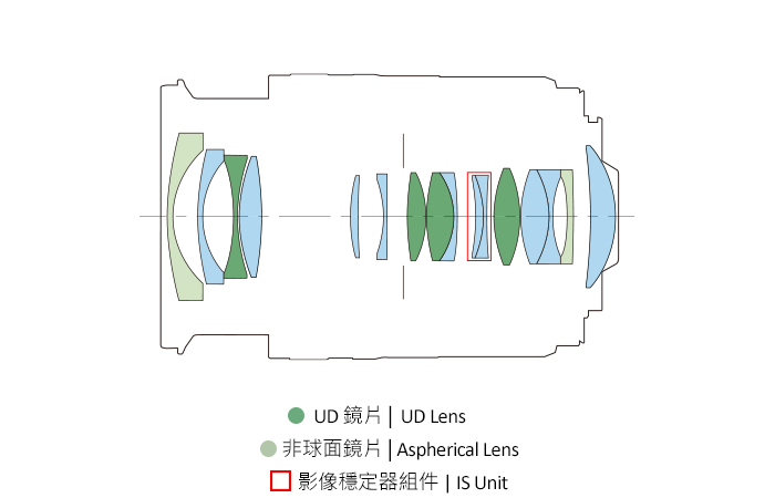 4 片 UD 超低色散鏡片校正整個變焦範圍內的色差,實現減少色彩模糊的清晰影像。最佳化的 UD 鏡片數目和排列平衡使鏡頭能夠實現銳利、鮮明的質素,直至最細微的細節。