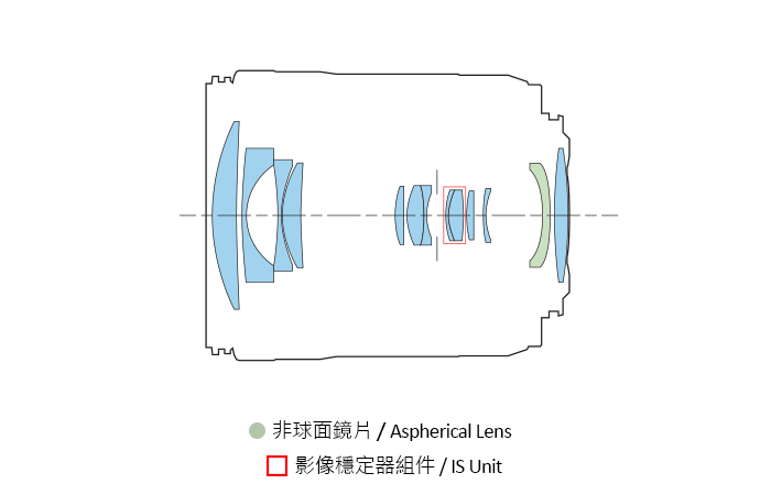 受惠於RF鏡頭接環的大口徑及短後對焦距離的優點,RF24-105mm F4-7.1 IS STM的11組13片光學設計透過加入1片PMo非球面鏡片及於更接近焦平面的位置配置一枚大口徑鏡片,令整個變焦範圍及畫面中心至邊緣均提供更佳影像質素。