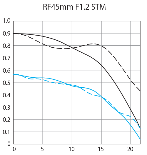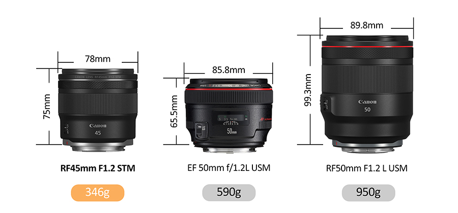 RF45mm F1.2 STM 採用了一片 RF 鏡中最大口徑的 PMo 非球面鏡片,配合相機的電子變形校正,減少了鏡片的數目,讓鏡頭在擁有 f/1.2 超大光圈的同時仍能保持輕巧的設計。此外,鏡頭使用結合電子對焦系統的齒輪型步進馬達 (Gear-type STM),與傳統環型超聲波馬達相比,能大幅縮小鏡頭的體積與重量。鏡頭亦採用前對焦及固定長度鏡筒設計,讓鏡頭可採用樹脂代替金屬凸輪筒,進一步減輕 f/1.2 鏡頭的重量。