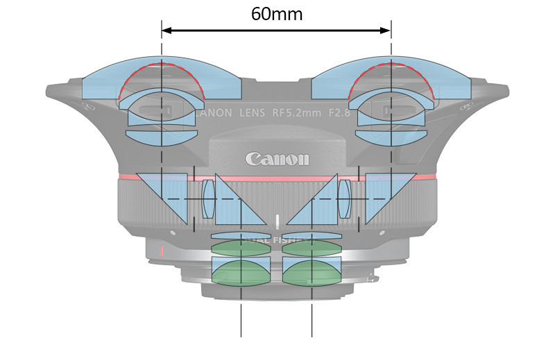 RF5.2mm F2.8 L DUAL FISHEYE 由左、右兩支魚眼鏡頭組成,鏡頭覆蓋達190o視角並採用適合VR影片的製作等距投影設計 (Equidistant projection)。每支魚眼鏡頭採用創新的 10 組 12 片折疊式光學 (Folded Optics) 設計,加入2個稜鏡以在全片幅影像感應器 (36mm x 24mm) 上實現基線長度 60mm 的自然視差 (parallax),只需直接將此可換鏡頭安裝至兼容相機1就可以拍攝3D VR影像而不需要使用專用的相機,大幅簡化3D VR拍攝流程。