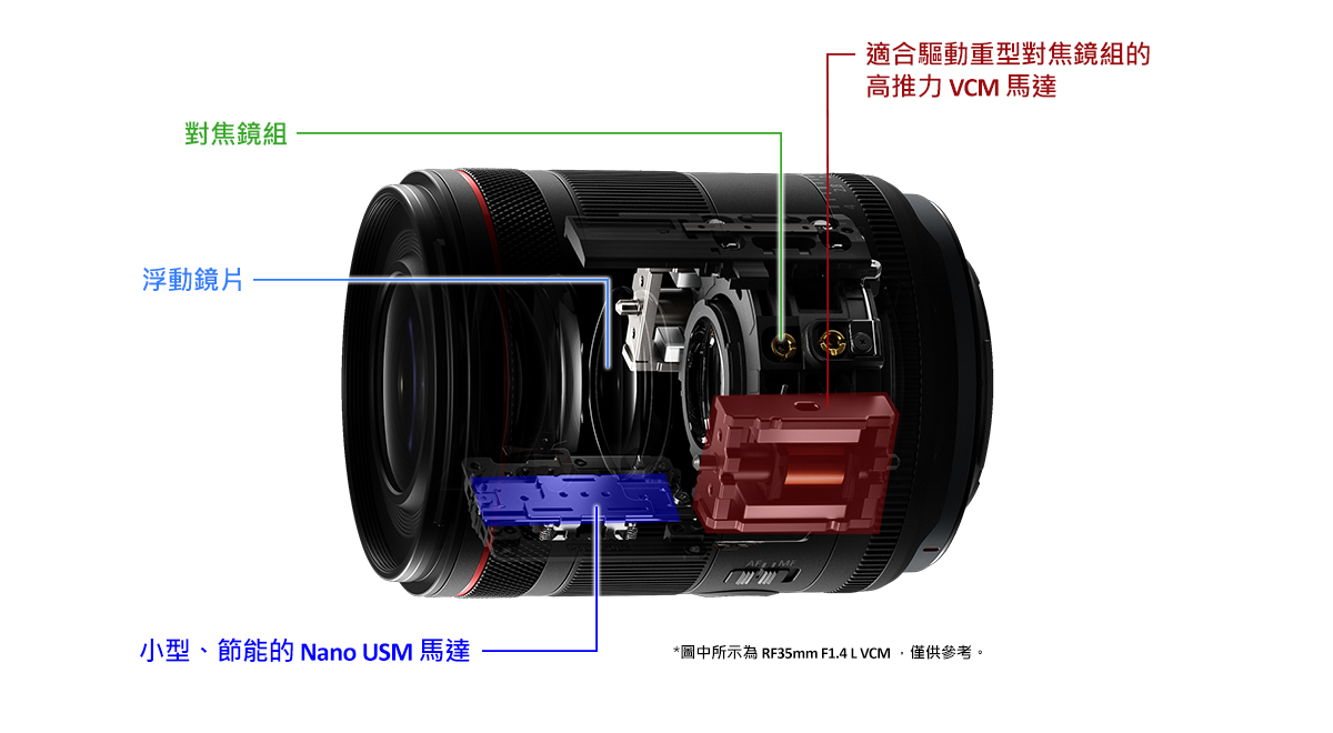 RF50mm F1.4 L VCM 採用「電子浮動對焦控制」技術 ,以 VCM 馬達 (Voice Coil Motor) 及 Nano USM 馬達分別獨立推動「對焦鏡組」及「浮動鏡片」。高推力的VCM 音圈馬達驅動較大型、較重的「對焦鏡組」,而小型、節能的 Nano USM 馬達則負責驅動輕量的「浮動鏡組」,這個結構為這大光圈鏡頭提供了高速、流暢的自動對焦。