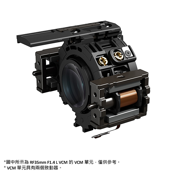 VCM 音圈馬達 (Voice Coil Motor) 是一種利用磁場將電能轉換為動能的致動器。RF50mm F1.4 L VCM 使用的 VCM 馬達透過讓線圈在驅動磁鐵產生的磁場中往復運動,以線性驅動固定在線圈上的對焦鏡組。