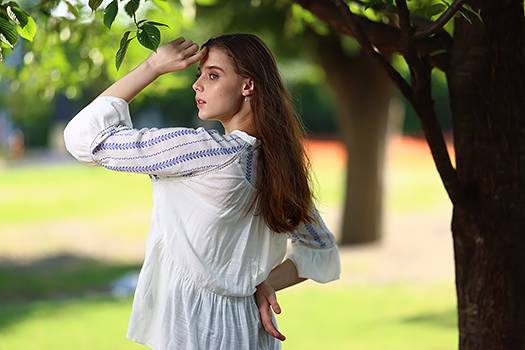 陽光穿過樹葉後變成綠色,需要使用閃光燈用作輔助光,在保留周圍色彩的同時重現美麗的膚色。