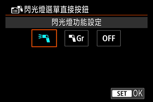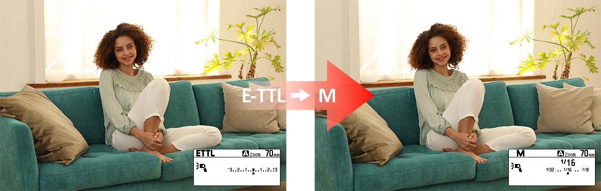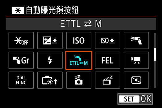 此外,更可以自訂相機按鈕直接將閃光燈由 E-TTL 自動閃光模式轉換至手動閃光模式並應用 FE 記憶設定。
