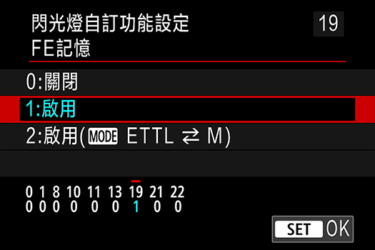 以相機設定閃光燈自訂功能C.Fn-19: FE 記憶