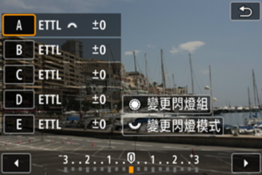 在 E-TTL 模式下,可進行控制最多三組閃光燈拍攝。而在閃燈組 (Gr) 模式下,最多可以單獨控制五個閃燈組,以更多閃光燈創造新的可能性。
