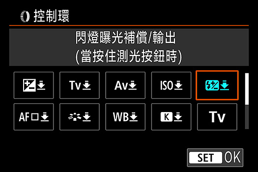 當使用 EOS R6 Mark II 及以後推出的兼容相機時,可以將[閃燈曝光補償/輸出]功能指定至控制環。視乎閃光燈的模式 (E-TTL /手動),不單可以利用控制環改變閃燈曝光補償,更可以改變閃燈的輸出。