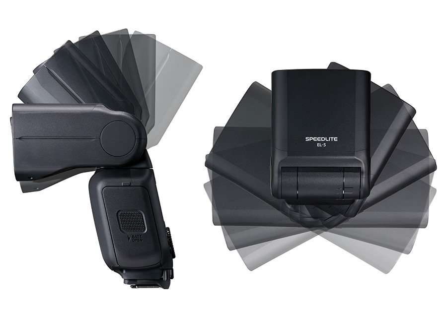 Speedlite EL-5 提供了靈活的反射閃光角度,閃光燈頭可根據需要向左或向右旋轉約 180°,向上約 120°,向下約 7°,便於控制光線從不同的角度進行反射閃光拍攝。原先旋轉燈頭角度時須按下反射角度鎖定釋放按鈕, Speedlite EL-5 取消了這個按鈕,可直接旋轉燈頭,角度的調整更加快捷。