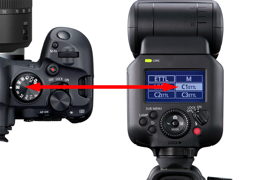 當使用 EOS R6 Mark II 及以後推出的兼容相機時7,用家可以經相機設定閃光燈自訂功能 C.Fn-19: FE 記憶。此外,更可以自訂相機按鈕直接將閃光燈由 E-TTL 自動閃光模式轉換至手動閃光模式並應用 FE 記憶設定。