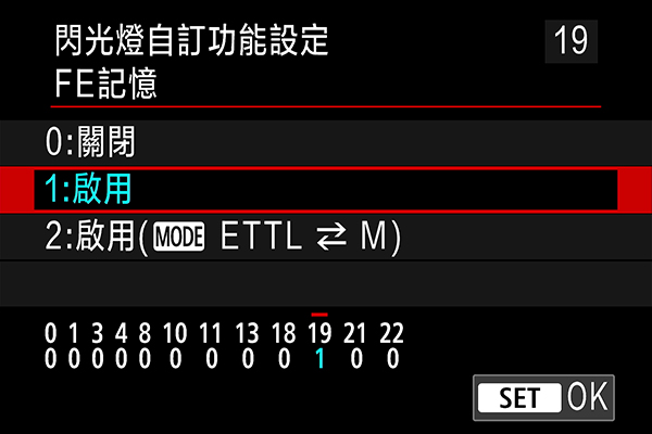 以相機設定閃光燈自訂功能C.Fn-19: FE 記憶