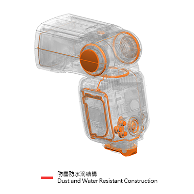 Speedlite EL-5 提供與 EOS R5 同級的防塵防水滴效能。為確保密封,外殼的連接處都加入了密封材料。即使在困難的條件下拍攝,都可以防止塵或水滴進入閃光燈。