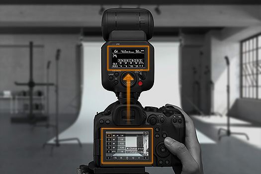 當使用 EOS R6 Mark II 及以後推出的兼容相機時,可以將[閃燈曝光補償/輸出]功能指定至控制環。視乎閃光燈的模式 (E-TTL/手動),不單可以利用控制環改變閃燈曝光補償,更可以改變閃燈的輸出。