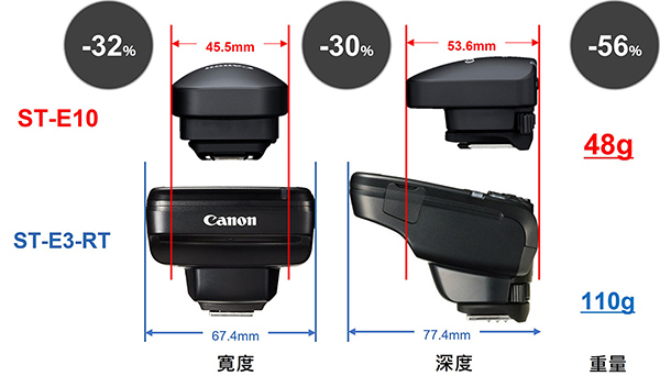 無線閃光燈信號發射器 ST-E10 專為配合多功能靴而設計。由於能夠直接從相機獲取電源及使用相機螢幕進行閃光燈設定,令設計簡單輕巧,重量只有 48 克。