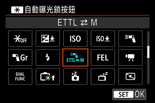 - 選單按鈕方便即時在相機螢幕顯示閃光燈功能設定選單
