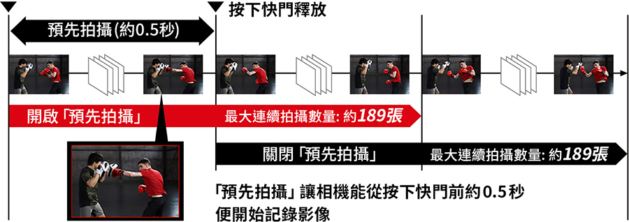 首次於全片幅EOS相機加入支援每秒 30張的無裁切「RAW連拍模式」9,並提供按下快門前0.5秒的「預先拍攝」,最大連續拍攝數量可達約189張 (UHS-I),確保能記錄最精彩時刻。